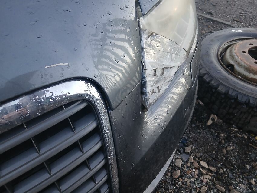 Damage down passenger side, damaged front passenger headlight front end damage, scratches all over