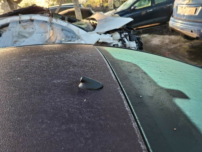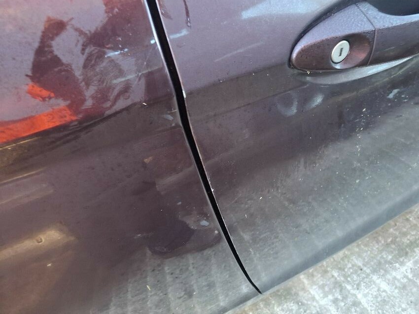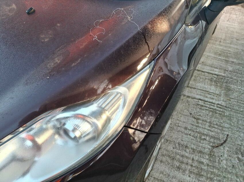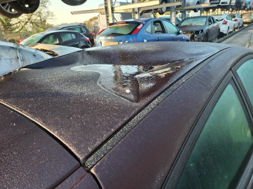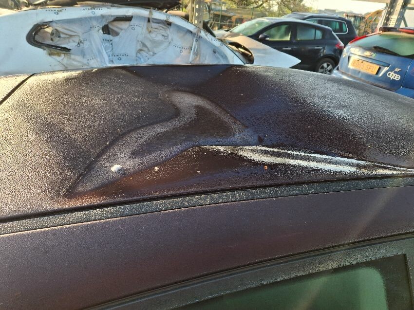 Roof dented heavily, wing mirror damaged, scuffed bumpers. dented front bumper. general wear and tear.