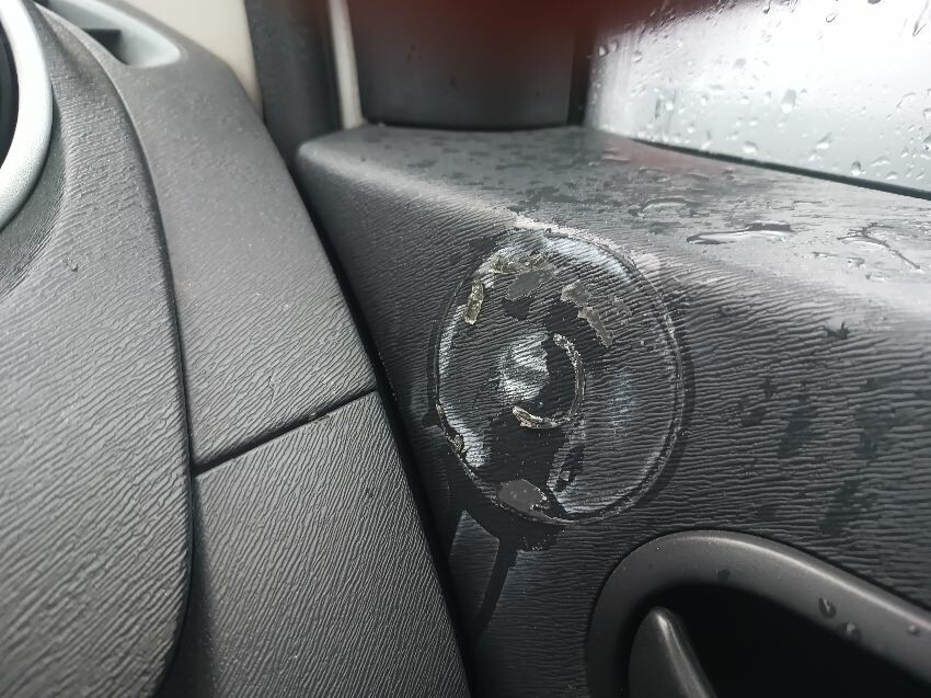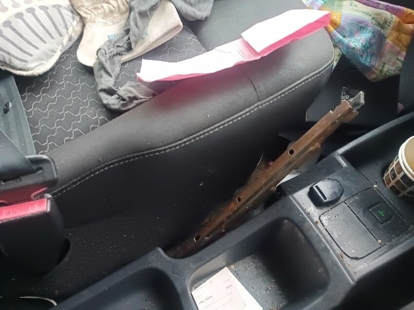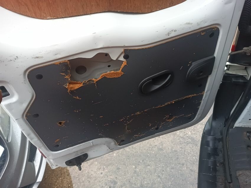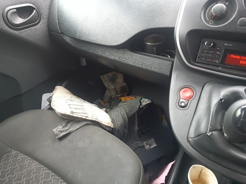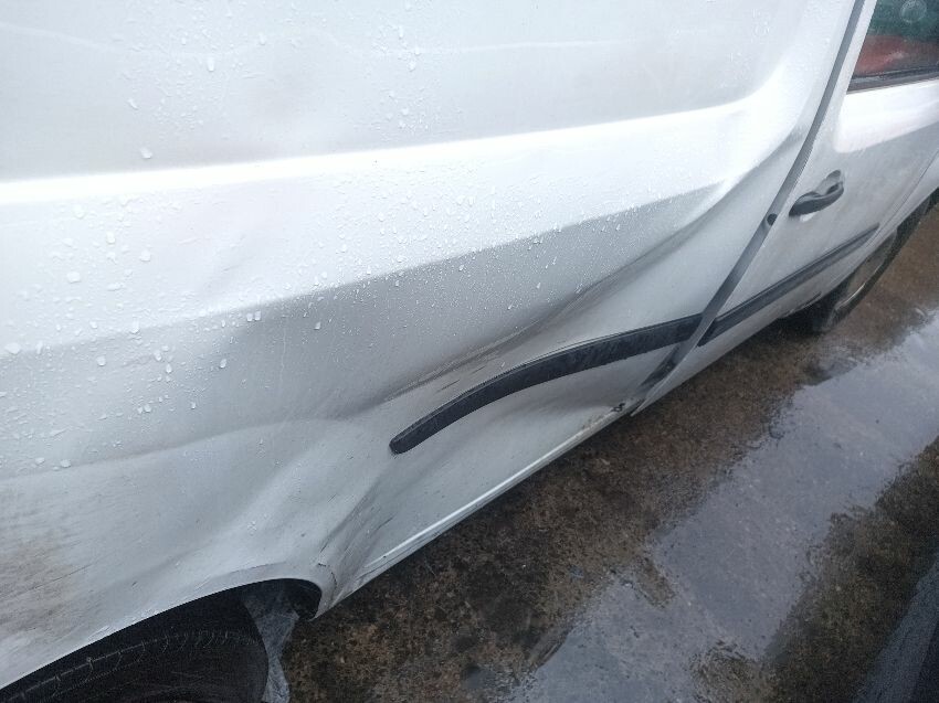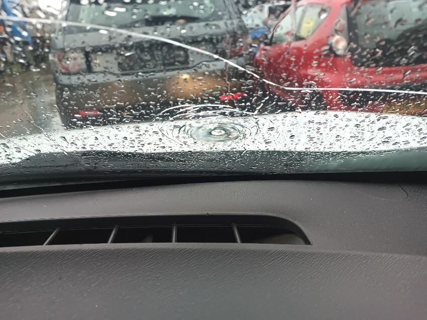 Engine light is on, abs warning light is on, brake warning light is on, maintenance reminder light is on, handbrake lever grip is missing, drivers side sun visor is missing, windscreen is cracked, drivers side has a massive dent in the side, passenger wing mirror is damaged, glue on drivers door card, interior full of rubbish, rear door cards are damaged, general wear and tear.