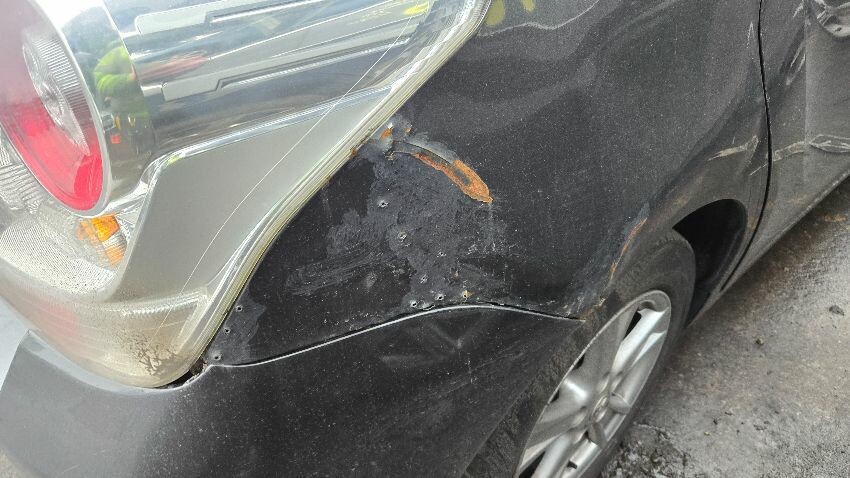 N/s/f wing damaged, front bumper damaged, bonnet has stone chips, o/s/f wing mirror damaged, o/s/f indicator damaged, o/s/f door damaged, o/s/r panel damaged, rear bumper damaged,