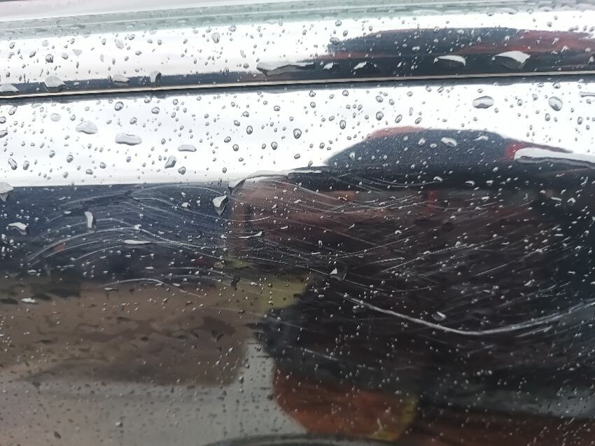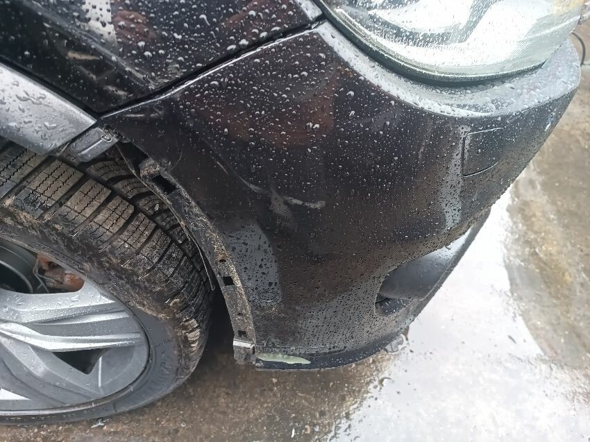 Wet interior, passenger front door is scratched, passenger wing mirror is scratched, passenger front wheel on spare, front bumper loose & damaged, general wear and tear.